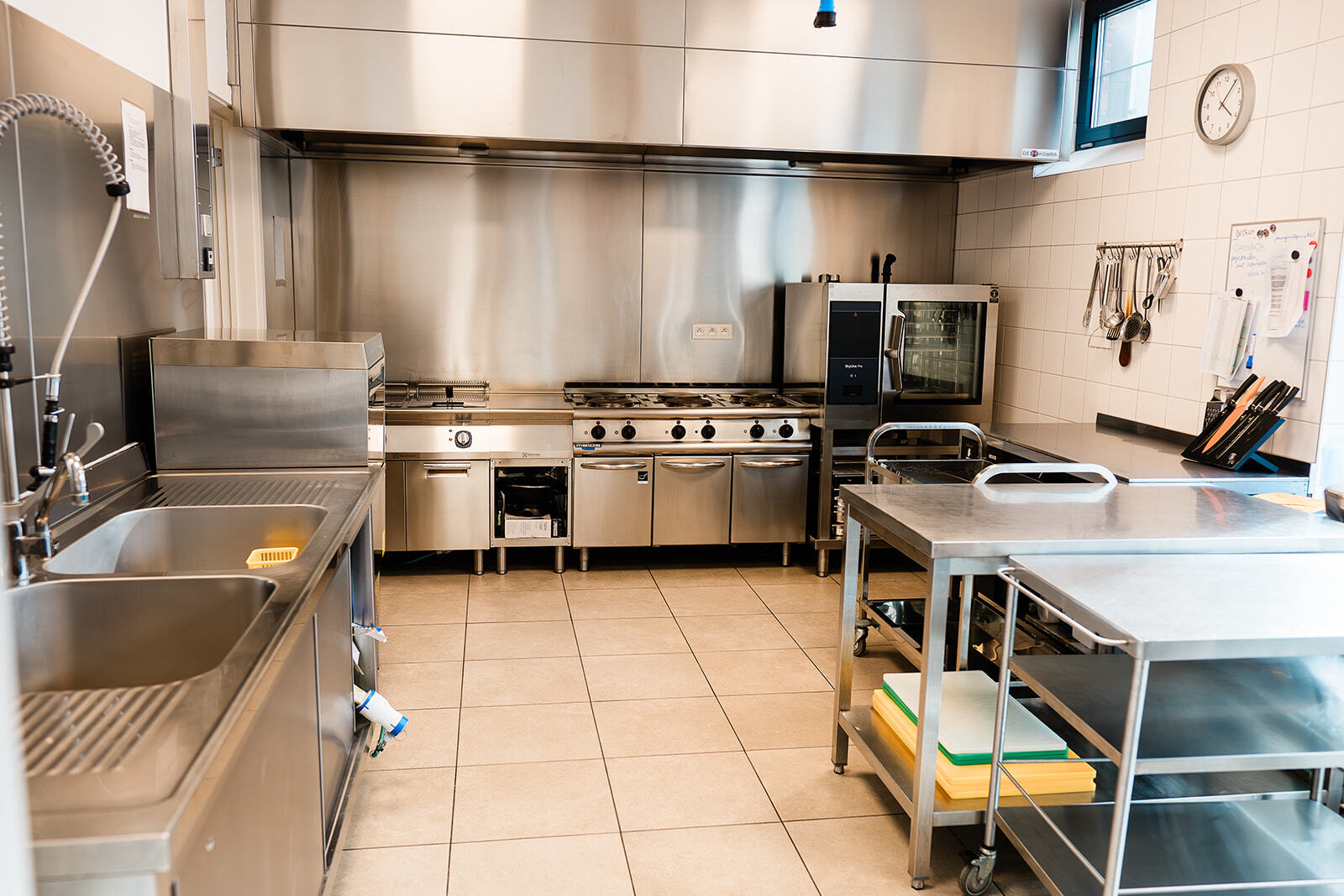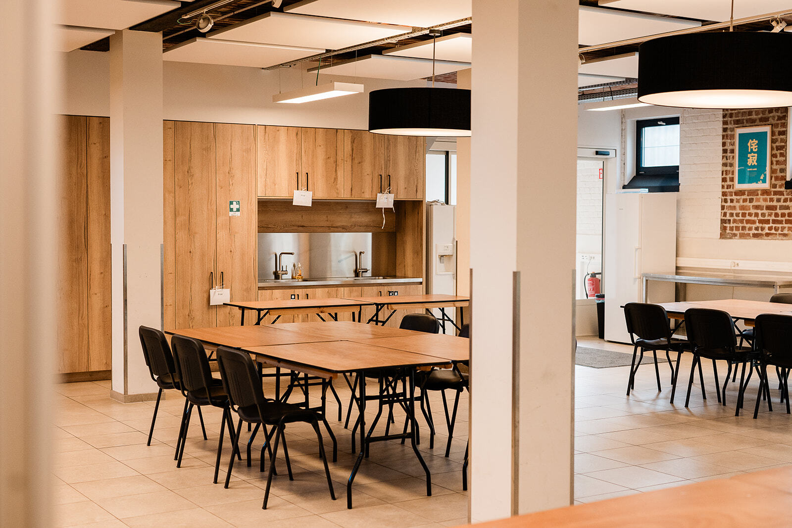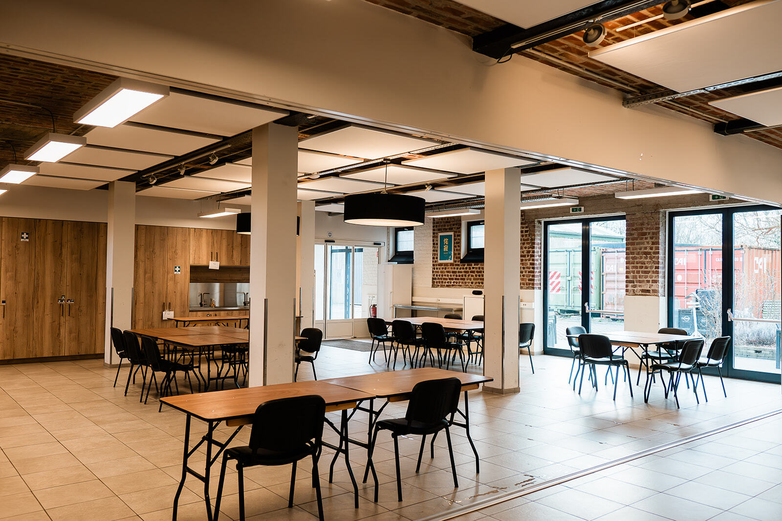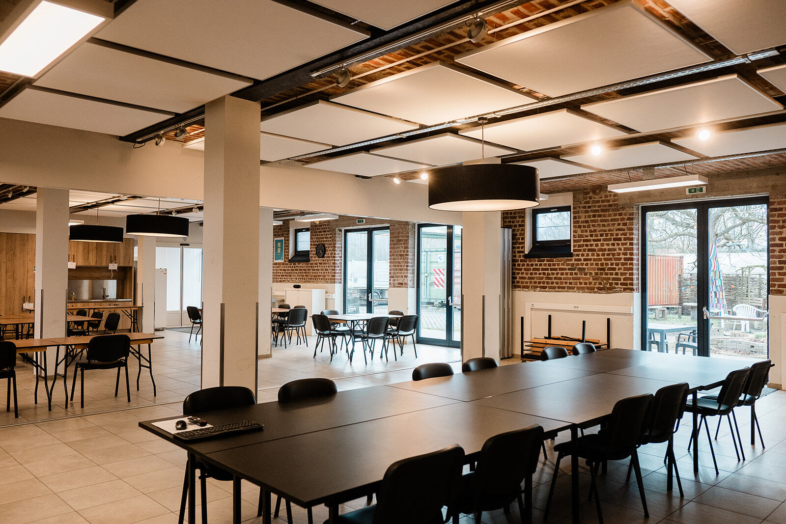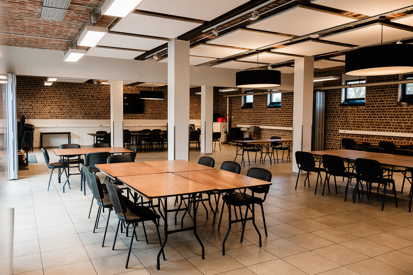 Naast een grote ruimte is er ook een industriële keuken, aangepast sanitair, vestiaire, groot scherm en geluidsinstallatie.